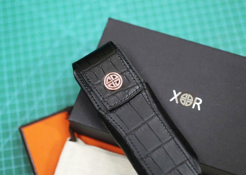 Điểm nhấn đắt giá nhất trên chiếc bao da XOR cá sấu Alligator đen chính là huy hiệu logo thương hiệu XOR màu vàng hồng lấp lánh ở mặt trước nắp. Được chế tác từ kim loại quý với kỹ thuật bo viền sơn thủ công bóng bẩy, huy hiệu này như một chiếc nhẫn đại ca, tỏa sáng rực rỡ trên nền da Alligator Pháp thâm trầm.